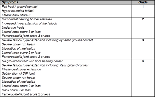 The foal presents a dynamic, constantly evolving model due to its growth and therefore should not be judged in the same way as an adult horse is appraised (Castelijns 2001). However, except for the assessment criteria for the head and neck area, there is little in the way of published guidelines for the assessment of foal conformation. Digital hyperextension (McKinnon et al 2011 commonly affects both hind limbs. It has been described as a defect that tends to self-correct within days with moderate exercise without the need for treatment. It is, however, the author’s experience that is not that rare to observe 4- to 6-week-olds who are still lifting the toes off the ground when loading the limb. For clarity the authors classify cases of digital hyperextension into 4 grades (Table 1), based on presentation and in addition to severity of symptoms and associated pathologies (figure 1).
