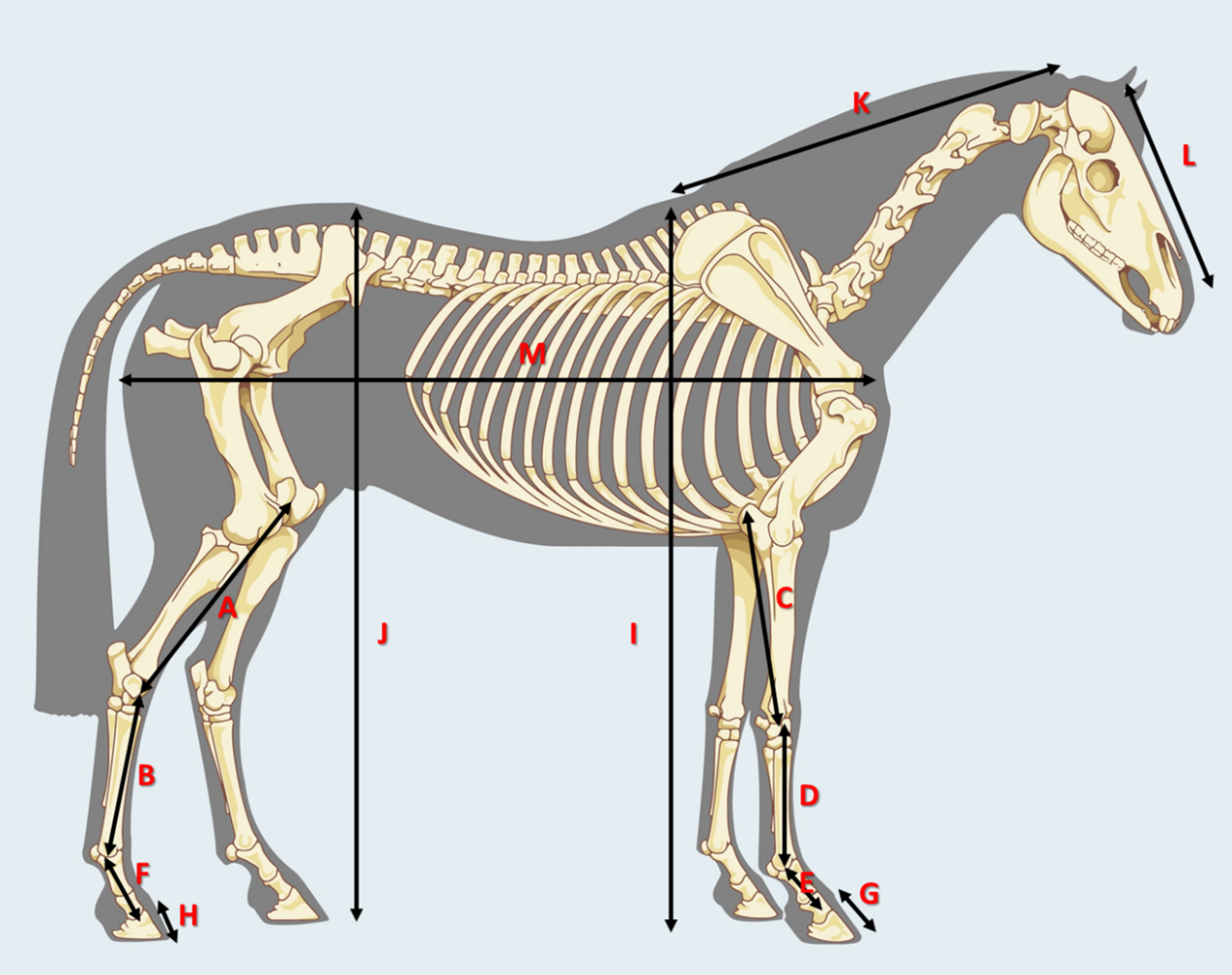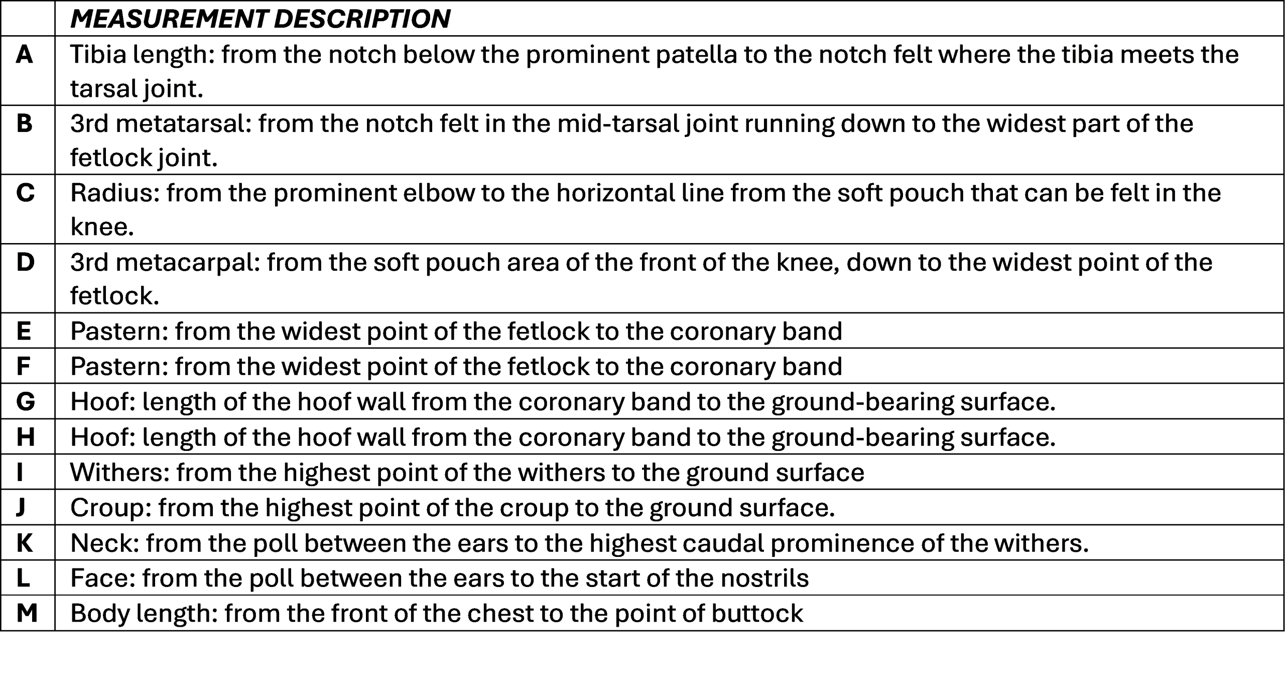 All foals were held by two experienced foal handlers to control and maintain calmness of each foal. The handlers ensured that whilst static both the forelimbs and the hind limbs were together, ensuring the subject present an accurate presentation of the conformation for individual foals. Once satisfied that the position of the subject was in the correct position a custom-made measuring stick was used by the lead researcher to collect the measurement data (table 2). To ensure reliability an assistant checked the measurement data prior to recording. The data for both groups was recorded on an individual assessment form which included a group and foal identification number (Figure 3).