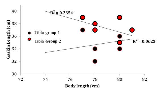 Figure 3 scatter graph comparing tibia ‘gaskin’ lengths between both groups of foals with body length. There was a significant difference in tibial length between both groups (mean -2.4cm ± 0.9 cm p=0.020). Data are displayed in cm n=8 group 1 n=7 group2.