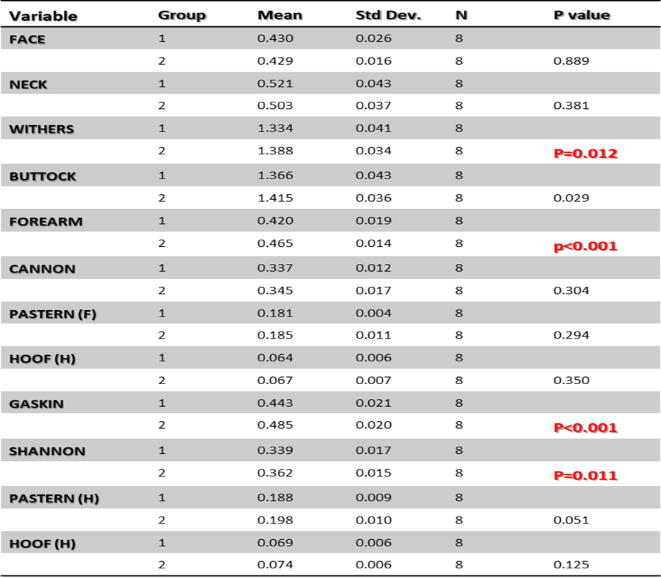 Table 2 descriptive statistics and significance results for body segments as a proportion of body length between cases without (group 1) and with (group 2) digital hyperextension syndrome. Significance was tested at p<0.05