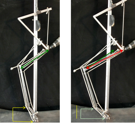 Figure 4 Mechanical models. Image on the left demonstrates a non-hyperextension conformation with the green line representing the length of the tibia and the yellow lines representing the height of the fetlock from the ground surface. Image on the right demonstrates a hyperextension conformation with the red line representing the longer tibia length and the light green lines representing the height of the fetlock from the ground surface.