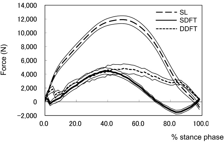 Fig 1. Peak force (N) exerted on SDFT, DDFT and the Suspensory ligament (SL) during the stance phase