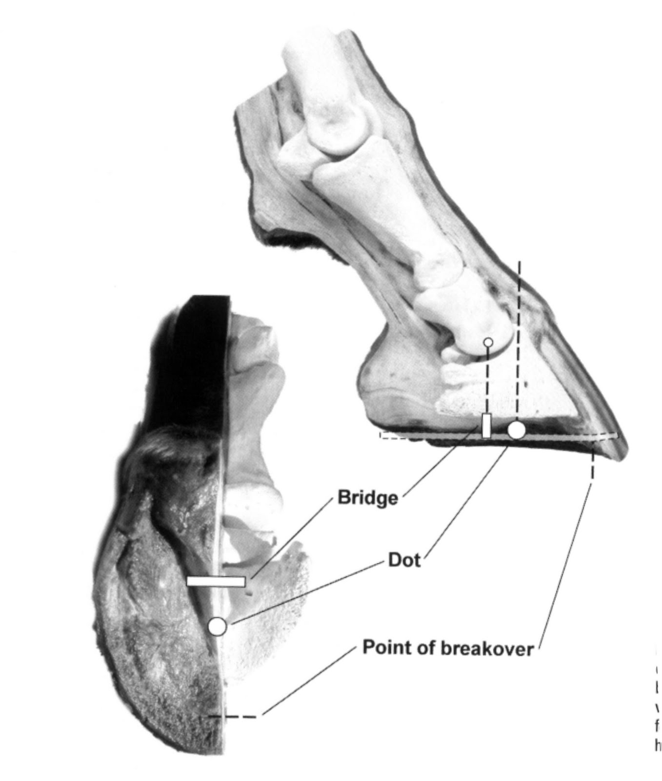 British farrier David Duckett is renowned for introducing a practical system of external reference points to evaluate hoof balance. In 1990, Duckett identified two key landmarks on the foot: “Duckett’s Dot” and “Duckett’s Bridge.” The Dot corresponds to the extensor process of the coffin bone (the distal phalanx) – essentially aligning with the tip of the pedal bone and the intersection of the hoof’s main tendon forces. Duckett described this Dot as the balance point of the distal phalanx and approximately the centre of pressure of the hoof. The Bridge, on the other hand, is located at the widest part of the hoof’s solar surface (around the frog’s apex region). Notably, this Bridge closely matches what earlier farriers like Russell called the hoof’s “centre of gravity.”