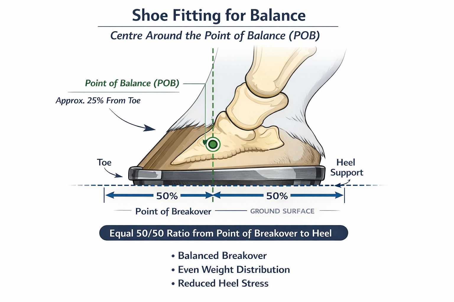 The practical takeaway: when trimming or shoeing, aim to centre the base of support around this point. That means setting up the hoof so that the distance from the toe to the POB is roughly equal to the distance from the POB to the end of the heel support. This can be done with your rasp and shoeing tools — no guesswork, just proportion.