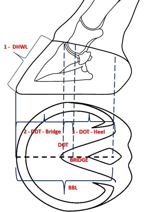 1990 external reference points Duckett’s “Dot” and Duckett’s “Bridge”. Duckett suggested that to achieve static foot balance three measurement indicators: (1) dorsal hoof wall length (DHWL), (2) the distance from the dorsodistal tip of the toe (DDT) to the widest point of the bearing border (DDT – Bridge) and (3) the distance from a point 9.5mm palmar of the frog apex (DOT) to the widest point of the frog (DOT-Heel) were equivalent. (Reproduced with permission of D. Duckett FWCF).
