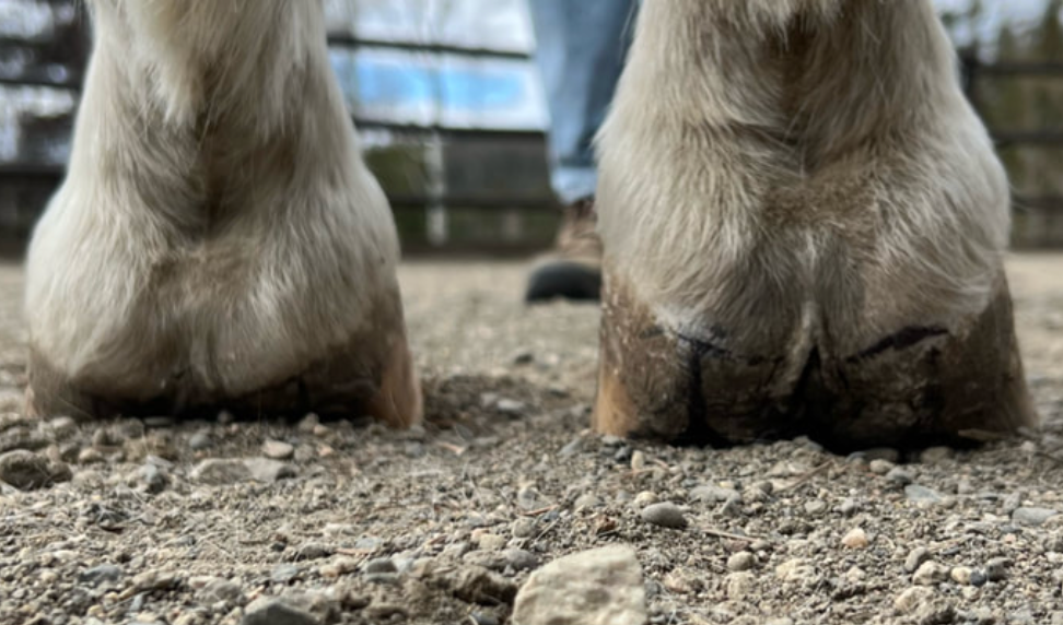 High-low syndrome refers to a condition where a horse’s front hooves are noticeably different in shape and angle. One hoof is typically more upright with a steeper angle and higher heel, while the other has a flatter profile, lower heel, and longer toe. It’s a common form of hoof asymmetry and may affect a horse’s movement and balance depending on the severity.