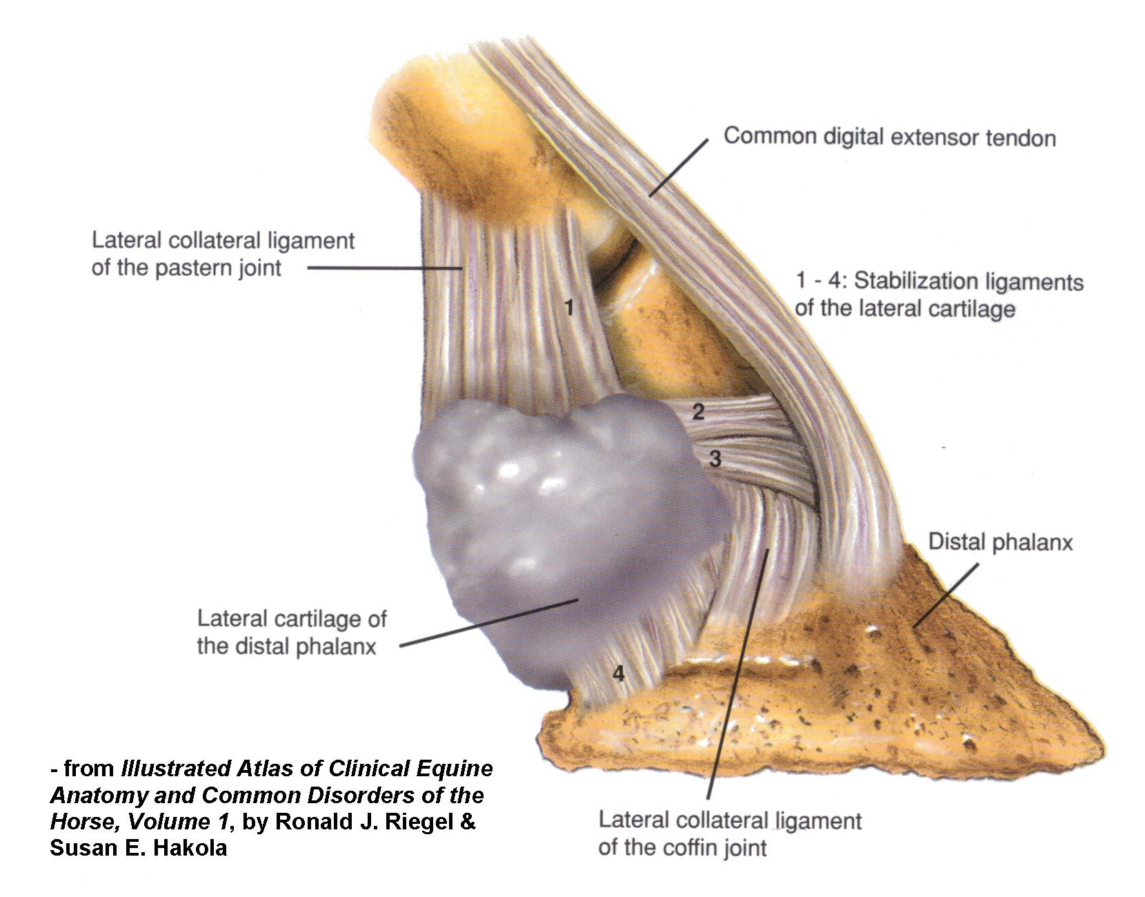 The collateral cartilages are paired structures, one medial and one lateral, attached to the lower (palmar or plantar) margins of the distal phalanx. They help the hoof capsule expand and contract under load, dampening concussion, absorbing impact, and modulating hoof capsule flexibility. They are intimately related to: