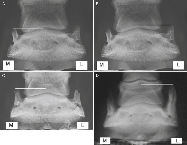 Fig. 3 Dorsopalmar radiographic view of a foot (medial is to the left in A–D) with grade 2 ossification of the medial cartilage of the foot (white line). B, Dorsopalmar radiographic view of a foot with grade 3 ossification of the lateral cartilage of the foot (white line). C, Dorsopalmar radiographic view of a foot with grade 4 ossification of the medial and lateral cartilages of the foot (white line). D, Dorsopalmar radiographic view of a foot with grade 5 ossification of the lateral cartilage of the foot (white line). M, Medial; L, lateral.(Reproduced from Veterinary Key)