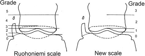 Fig. 2 The OUC grading systems. Grading of ossification according to the Ruohoniemi et al.8 scale (RS) and a new scale (NS) developed in this study. Left side shows moderate ossification with separate center of ossification and the dotted line is the navicular bone. Grading according to Ruohoniemi et al. Grade 0 No ossification, inclination sagittal. Grade 1 Ossification maximum to a level of palmar distal phalanx joint space. Grade 2: To a level of proximal palmar distal phalanx joint space. Grade 3: To a level of proximal border of navicular bone (dotted line). Grade 4: Proximal navicular bone up to distal half of middle phalanx. Grade 5: Ossification over distal half of middle phalanx. New grading according to SLU (new): Grade 0: Ossification not extending proximal of distal middle phalanx. Grade 1: Ossification extending between distal middle phalanx to a level of proximal palmar distal phalanx joint space. Grade 2: To a level of distal half of middle phalanx. Grade 3: To a level over distal half of middle phalanx.