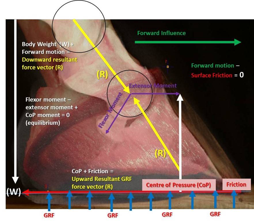 Understanding these vector changes supports farriery decisions: by designing shoes that shorten the lever arm of GRF and flatten tendon geometry, we can reduce peak loads. Conversely, misalignment of the shoe (e.g., apex too far caudal) or unexpected surface compliance may shift GRF in an unfavourable direction, increasing strain on palmar structures.