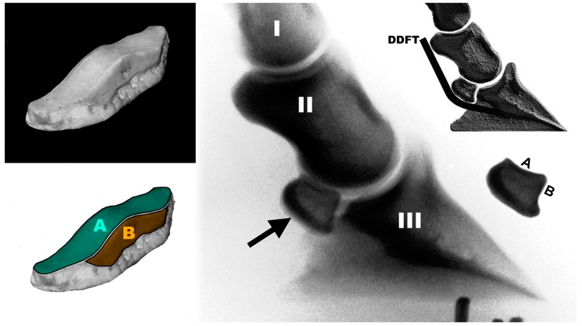 Fig 1. Navicular bone, iso-view, and medio-lateral radiograph (A: joint surface for the middle phalanx, B: joint surface for the hoof bone; I: proximal phalanx, II: middle phalanx, III: hoof (coffin) bone; arrow: navicular bone; DDFT: deep digital flexor tendon).