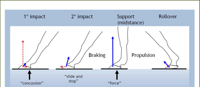 Upon initial hoof-ground contact the GRF vector typically has an upward and slightly cranial component; COP is initially more caudal/palmar and migrates during load acceptance (Hagen 2021). The DDFT begins tensioning to oppose the DIPJ moment induced by the GRF moment arm. If PA is higher due to the roller shoe, the DDFT’s line of action enters with a less acute angle relative to the navicular surface, potentially reducing the local contact pressure at this early phase.