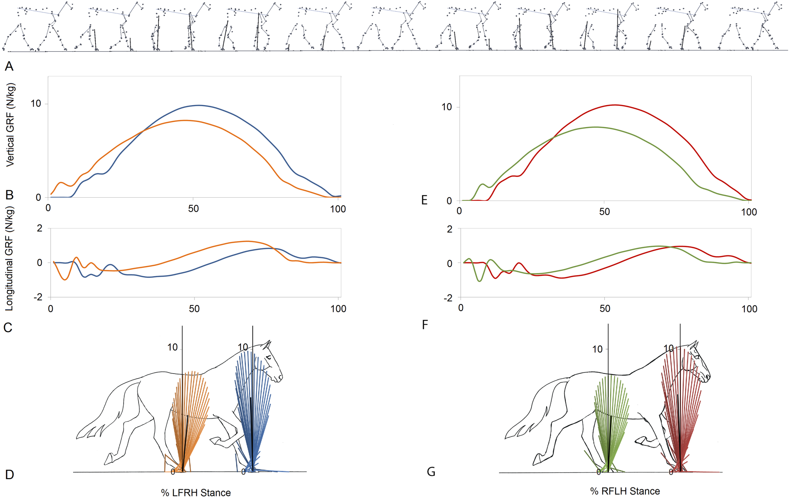 Fig 6. GRFv left fire and right hind through the stance phase a) vertical, b) horizontal and c) in visual limb Fv direction over stance time. . Magnitude over time is reflected by depth of the vector line